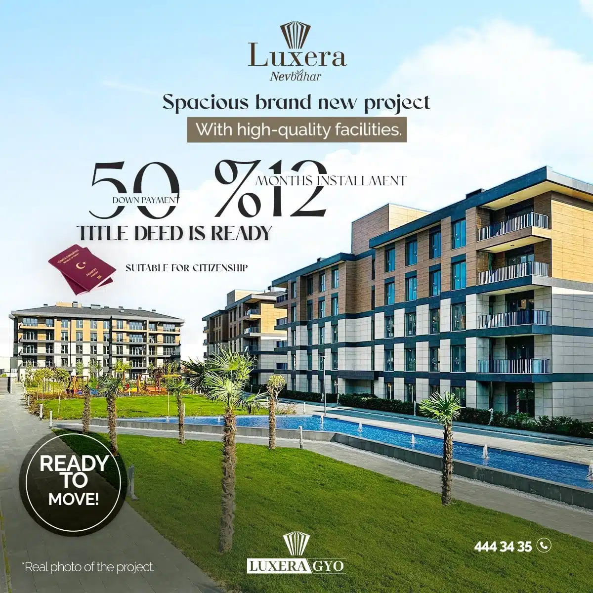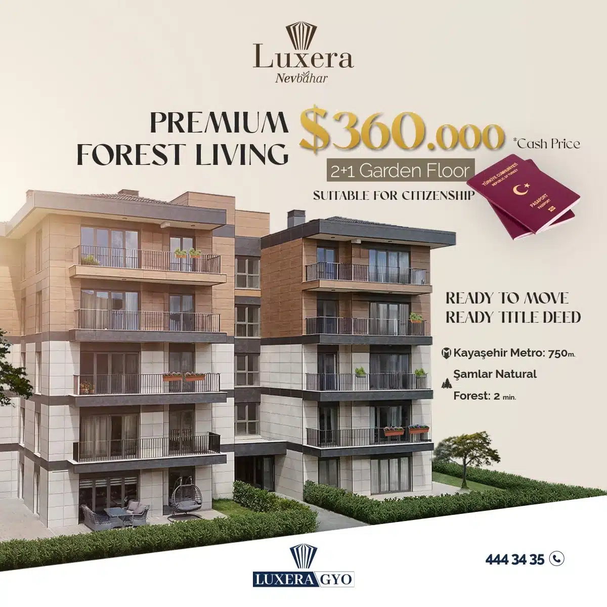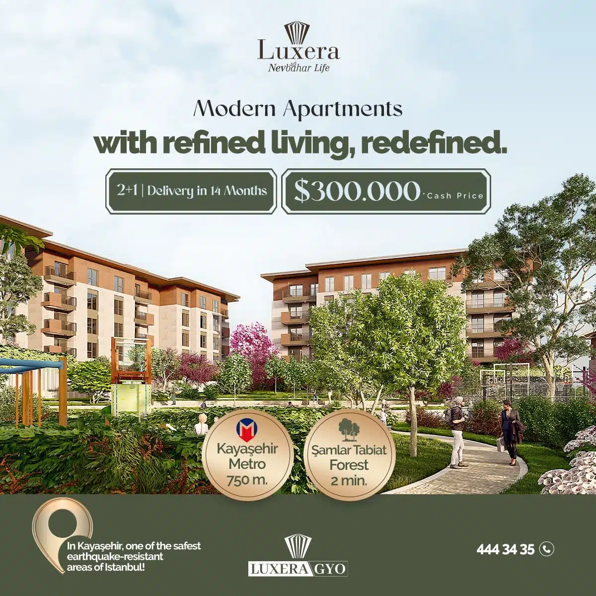 عيش في واحة من الهدوء والطبيعة داخل قلب إسطنبول! لوكسيرا نيفباهار لايف يقدم أسلوب حياة عائلي فاخر بتصميمات حديثة ومرافق متكاملة.”